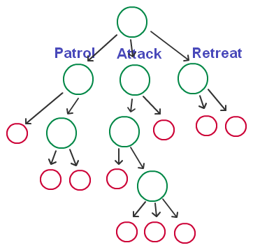 这是我们为一个士兵定义的一颗行为树(可以先不管这些绿圈和红圈是干吗的),首先,可以看到这是一个树形结构的图,有根节点,有分支,而且子节点个数可以任意,然后有三个分支,分别是巡逻(Patrol),攻击(Attack),逃跑(Retreat),这个三个分支可以看成是我们为这个士兵定义的三个大的行为(Behavior),当然,如果有更多的行为,我们可以继续在根节点中添加新的分支。当我们要决策当前这个士兵要做什么样的行为的时候,我们就会自顶向下的,通过一些条件来搜索这颗树,最终确定需要做的行为(叶节点),并且执行它,这就是行为树的基本原理。