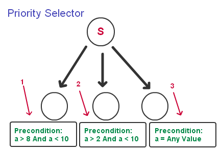 - 带优先级的选择节点(Priority Selector):这种选择节点每次都是自左向右依次选择,当发现找到一个可执行的子节点后就停止搜索后续子节点。这样的选择方式,就存在一个优先级的问题,也就是说最左边的节点优先级最高,因为它是被最先判断的。对于这种选择节点来说,它的子节点的前提设定,必须是“从窄到宽”的方式,否则后续节点都会发生“饿死”的情况,也就是说永远不会被执行到,为了更清楚的说明,看下面第一张图,这三个子节点在一个带优先级的选择节点下,它们的前提会被依次判断,可以看到这个三个子节点的前提从左向右,一个比一个更严格,如果我们现在a为9,按照下图的定义会执行第一个子节点,如果a为7,则会执行第二个子节点,如果a=11,则会执行第三个子节点。下面的第二张图演示了一种节点“饿死”(Starvation)的情况,我们看到第一个子节点的前提,比第二个子节点更宽泛,只要a<10,那自左向右判断的话,永远会进第一个节点,所以,如果要用到带优先级的选择节点,则必须检查每一个子节点的前提,以防止节点饿死的情况.