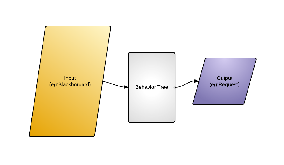 行为树的实现可以有多种多样,我这边提出一些建议,一般来说,行为树每个节点需要有进入(Enter),离开(Exit),运行(Execute)等部分,需要有行为节点(ActionNode),控制节点(ControlNode),前提(Precondition)等基类,然后,还需要定义行为树的输入(InputParam)和输出(OutputParam),一般来说,我们希望行为树是一个黑盒,也就是说,它仅依赖于预定义的输入。输入可以是黑板(Blackboard),工作池(Working Memory)等等数据结构,输出可以是请求(Request),或者其他自定义的数据结构,如下图: