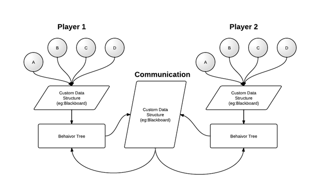 集中的方式的话,就是我们可以定义一个数据结构专门用于行为树的输入,将上面提到的需要用到的数据,在进行行为树决策前,先从各个模块中收集到这个数据结构里,然后再递交给行为树使用。集中式的输入减少了输入和行为树之间的接口数量(只和预定义的数据结构通信),但缺点是,存在数据冗余。不过,我们可以看到集中式的数据输入使得行为树的表现更像一个黑盒了(可以伪造数据来测试行为树),这也是我们一直以来想要的。可以参看下面对于两种方式的示意图: