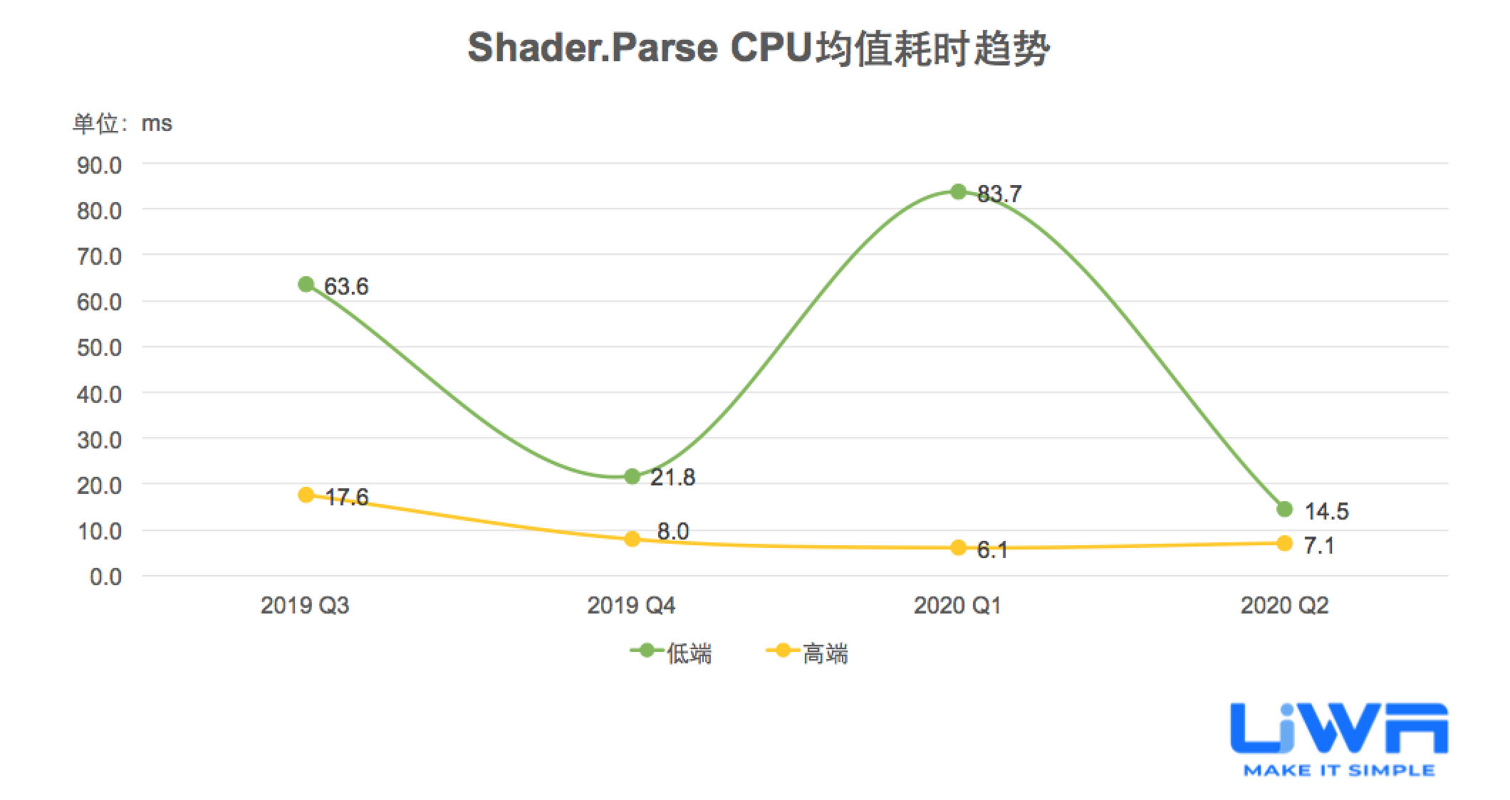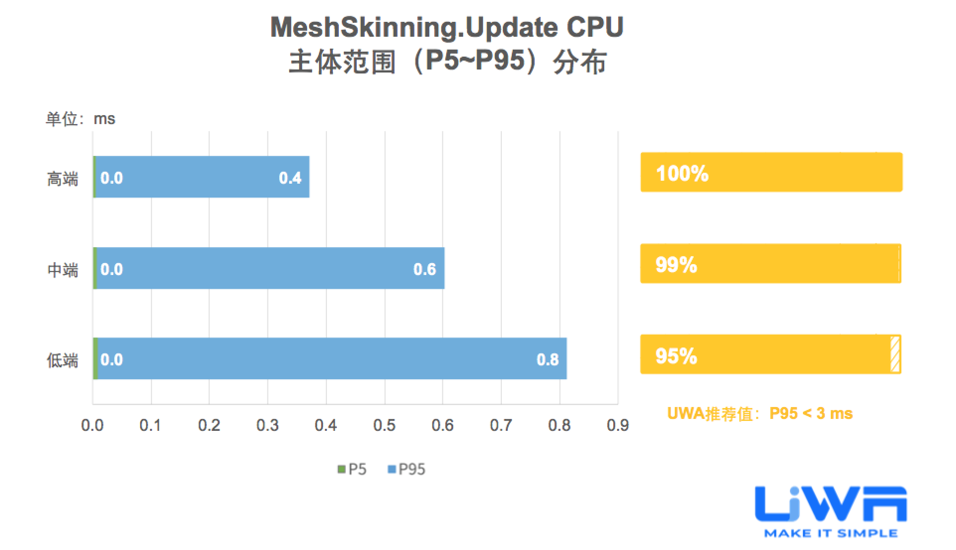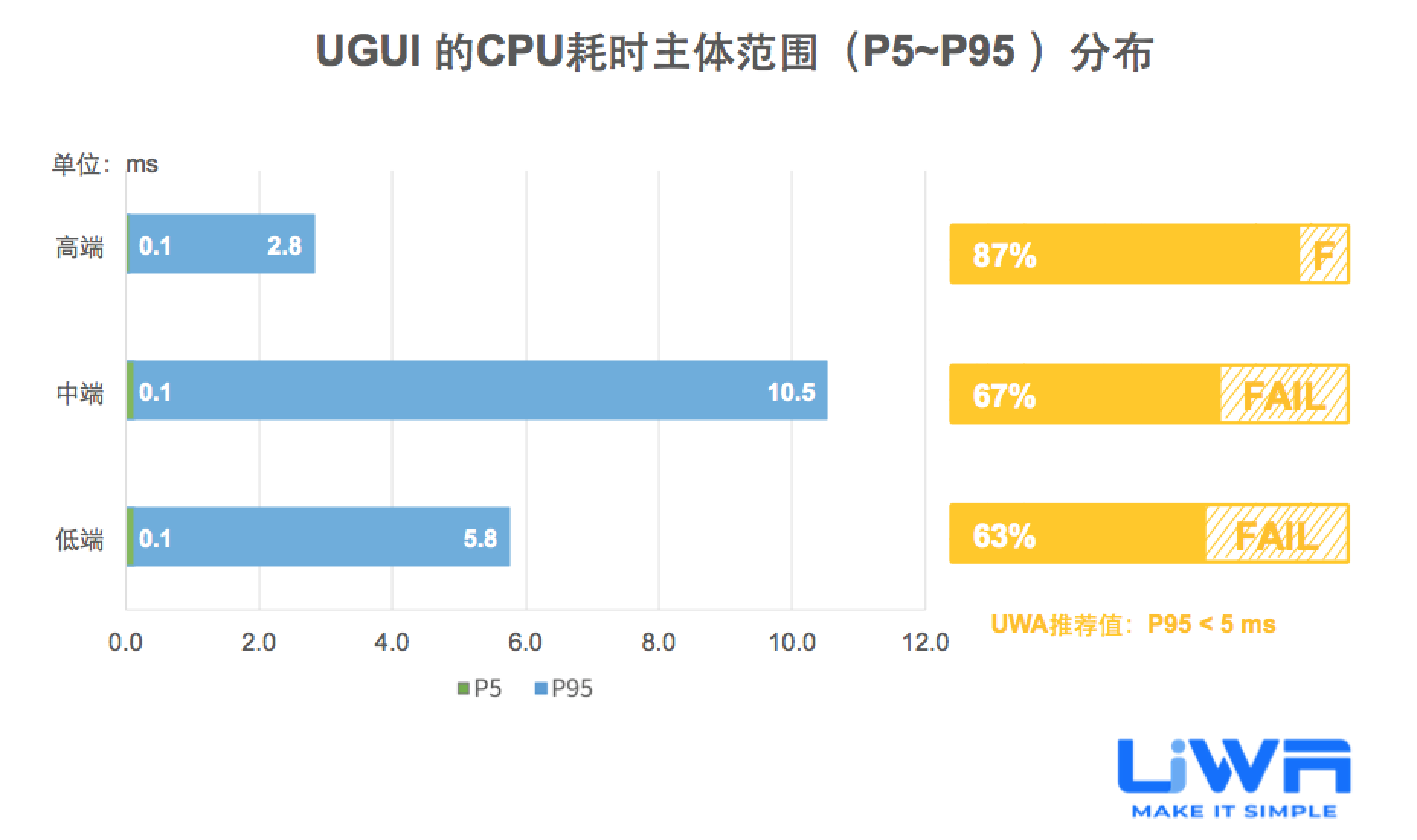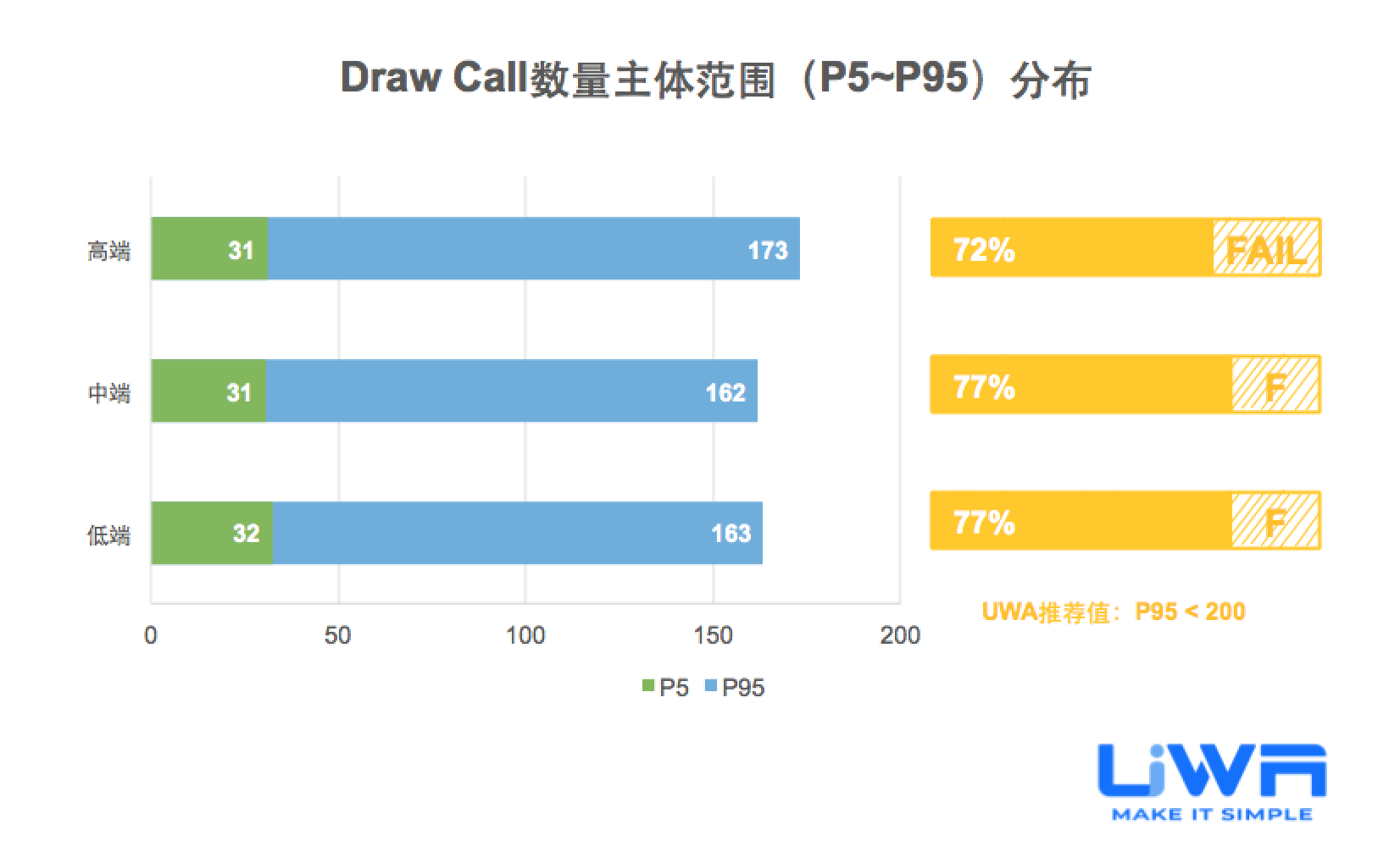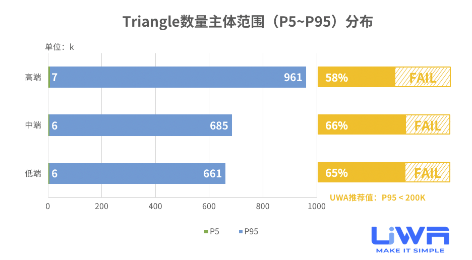 按照UWA官网(www.uwa4d.com)的测评机型分类,我们将统计的性能数据分为低端、中端和高端;在趋势图中则直接以最具有代表性的低端和高端来展现。