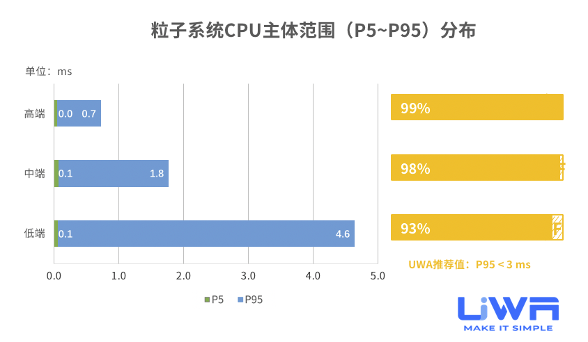 粒子系统的CPU开销普遍较低,但总体使用数量峰值在2020 Q1后大幅上升。我们依然建议研发团队尽可能将数量峰值控制在600以下(低端设备)和1000以下(中高端设备)。对此,建议研发团队经常通过以下两方面来检测自己的粒子特效使用情况:
