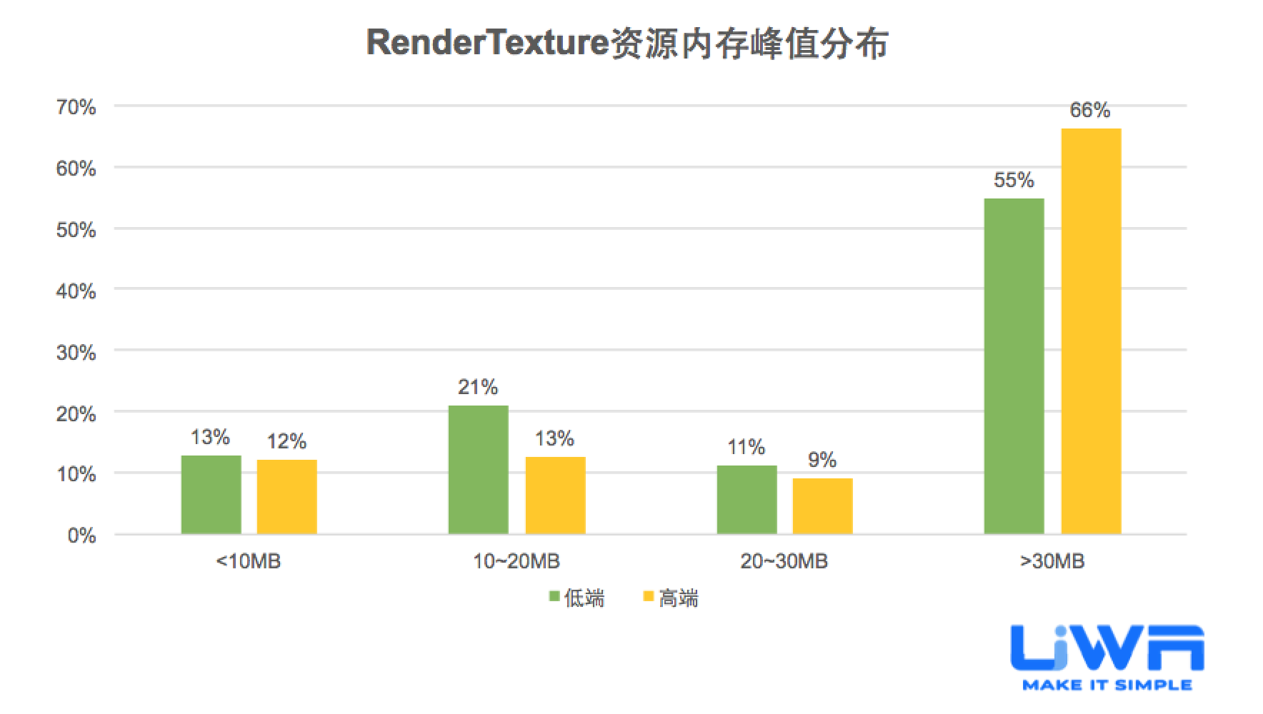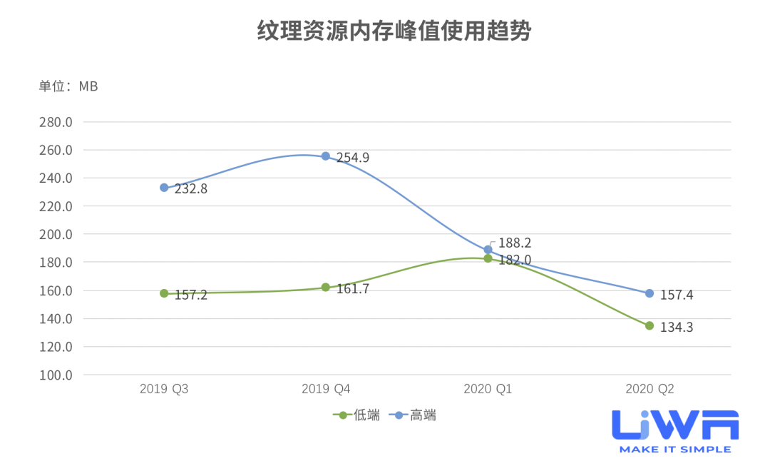 RenderTexture的内存占用在进入2020年Q1以后上升趋势明显,特别是在低端设备上,随着大家对于图像后处理效果的需求提升,后续很可能会出现RenderTexture使用程度大幅提升的情况,因此,建议研发团队对RenderTexture密切关注。