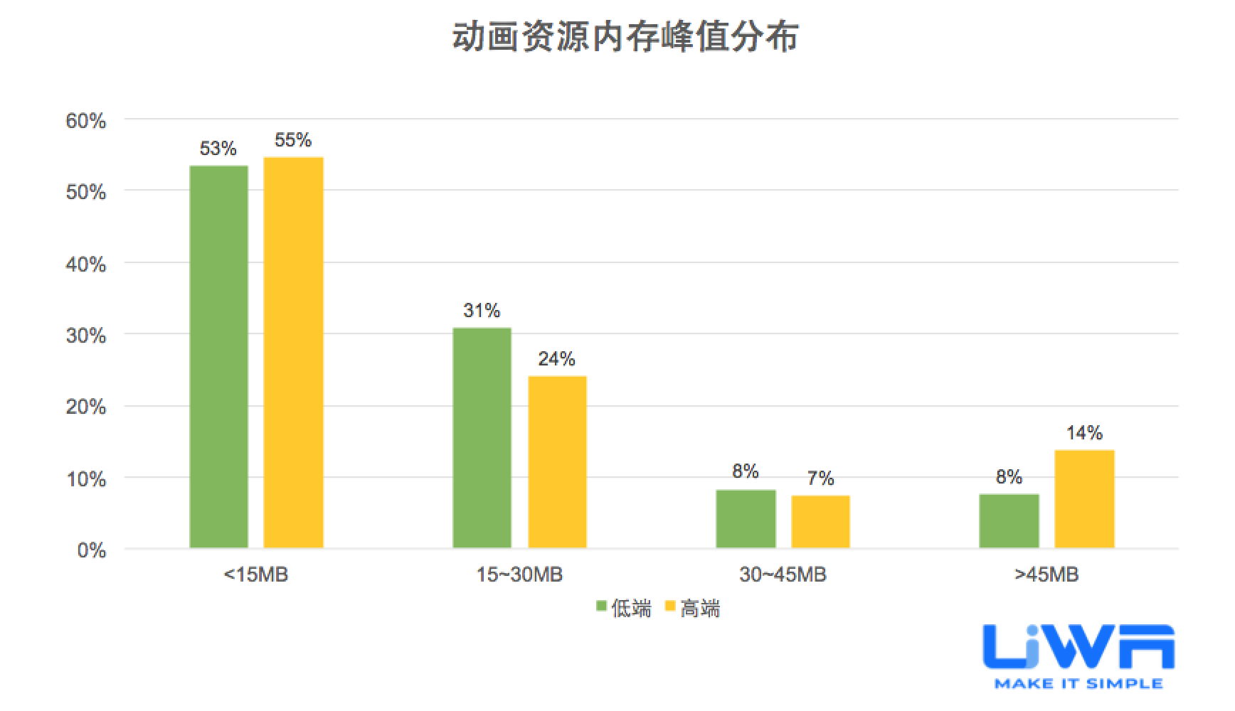 大部分卡牌手游在中低端设备的性能开销较好,大于33ms的耗时占比范围仅占30%。