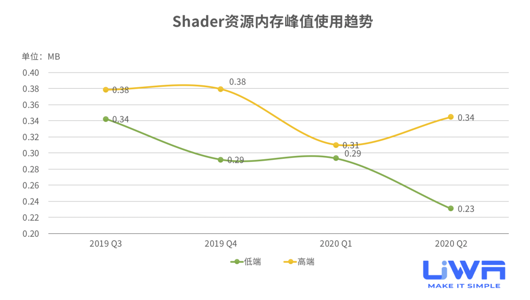 如上图所示,对于纹理资源来说,在过去的2个季度中,其内存占用处于下降阶段。建议研发团队对于纹理Mipmap使用情况、渲染利用率等进行进一步的检测和完善。