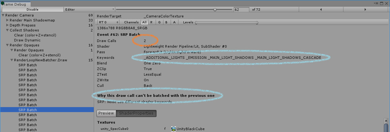 请参阅左侧的 SRP Batch 事件。另请参阅批次的大小,即 Draw Calls 的数量(此处为 109)。这是一个非常有效的批次。您还可以看到前一批被破坏的原因(“节点使用不同的着色器关键字”)。这意味着用于该批次的着色器关键字与前一批次中的关键字不同。这意味着着色器变体已更改,我们必须中断批处理。