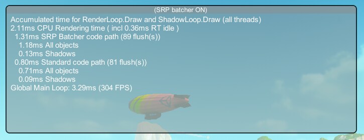 注意:计时是指在一帧期间调用的所有“RenderLoop.Draw”和“Shadows .Draw ”标记的累计时间,无论线程所有者是谁。当您看到“1.31ms SRP Batcher code path”时,可能 0.31ms 花费在主线程上,1ms分布在所有图形作业上。