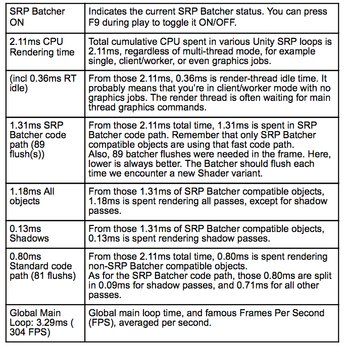 如果要在特定场景中使用 SRP Batcher 测量速度增加,则可以使用 SRPBatcherProfiler.cs C# 脚本。只需在您的场景中添加脚本。当此脚本运行时,您可以使用 F8 键切换覆盖显示。您还可以在播放过程中使用 F9 键打开和关闭 SRP Batcher。如果您在 PLAY 模式 (F8) 中启用覆盖,您应该会看到很多有用的信息: