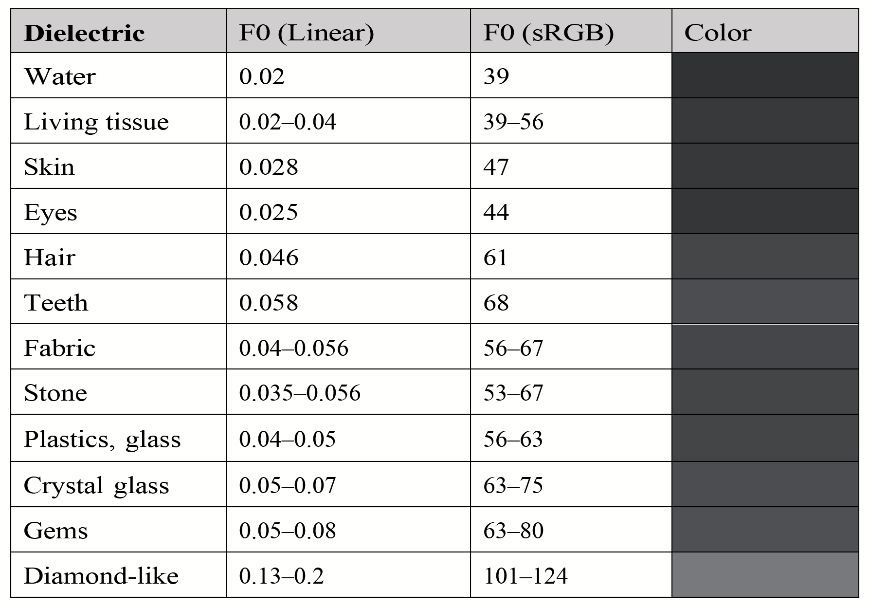 即是是最常见的半导体硅,在大多数场景渲染中也十分少见。出于实用性,PBR工作流一般不考虑半导体,即因避免在0.2和0.45之间的F0值。当然,故意尝试非真实感材质或外星场景中的材质时是例外。