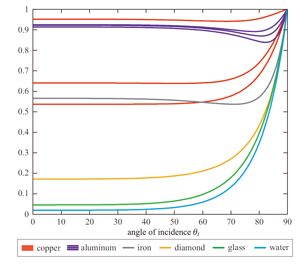 由于铜和铝在可见光谱上的反射率有明显变化,因此它们的反射率显示为R,G和B的三条独立曲线。铜的R曲线最高,其次是G,最后是B(因此它的红色)。铝的B曲线最高,其次是G,最后是R。上图选择的材质代表了各种各样的材质。 尽管如此,可以看到一些共同的地方。对于0°和45°之间的入射角,反射率几乎是恒定的。在45°和75°之间,反射率变化更为显着(通常但不总是有所增加)。最后,在75°和90°之间,反射率总是迅速变为1(白色,如果被视为一种颜色)。(图片来自Hoffman