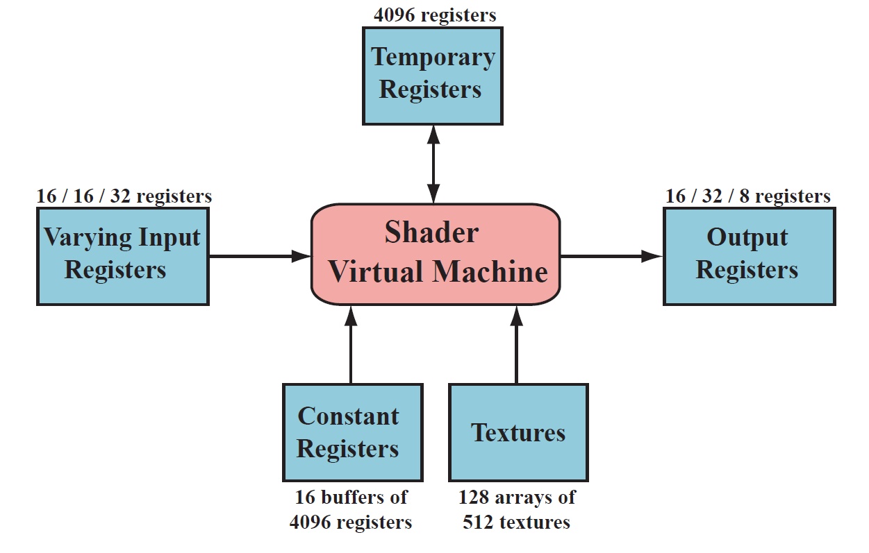 现代着色阶段(比如支持shader model 4.0,DirectX 10以及之后)使用了通用着色核心(common-shader core),这就表明顶点,片段,几何着色器共享一套编程模型。