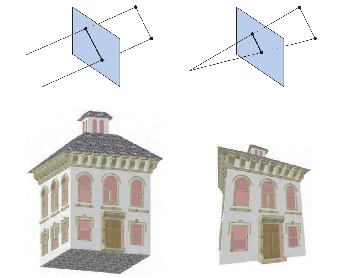 虽然这些矩阵变换是从一个可视体变换到另一个,但它们仍被称为投影,因为在完成显示后,Z坐标将不会再保存于的得到的投影图片中。通过这样的投影方法,就将模型从三维空间投影到了二维的空间中。