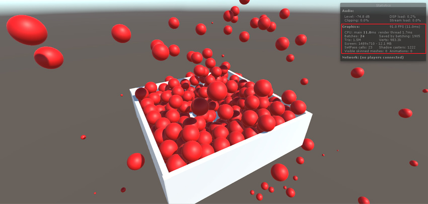 下面的截屏显示了具有多个游戏对象的相同场景;在顶部图像中,启用了 GPU 实例化,在底部图像中没有启用。请注意 FPS、Batches 和 Saved by batching 中的差异。