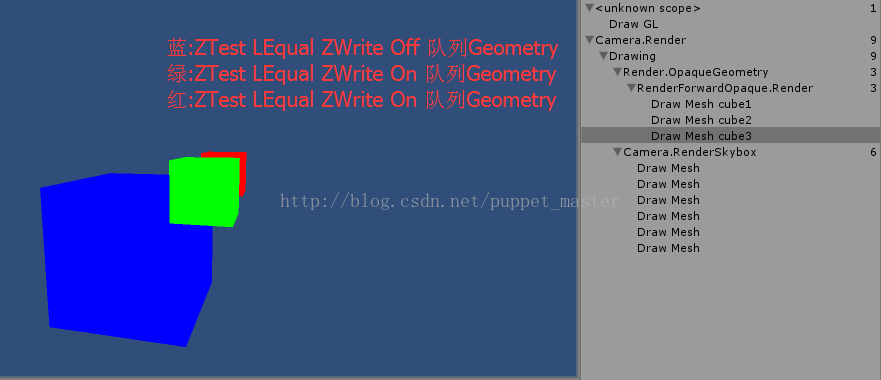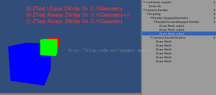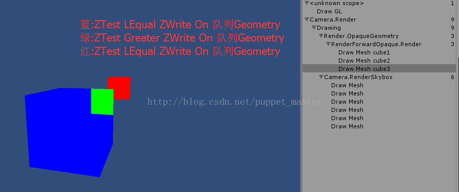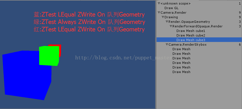 通过上面的实验结果,我们知道,按照从前到后的渲染顺序,首先渲染蓝色物体,蓝色物体深度测试通过,颜色写入缓存,但是关闭了深度写入,蓝色部分的深度缓存值仍然是默认的 Max,后面渲染的绿色立方体,进行深度测试仍然会成功,写入颜色缓存,并且写入了深度,因此蓝色立方体没有起到遮挡的作用。