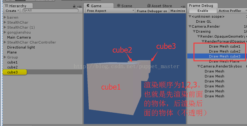 拿出 Unity,创建三个立方体,都使用默认的 bump diffuse Shader(渲染队列相同),分别给三个不同的材质(相同材质的小顶点数的物体引擎会动态合批),用 Unity5 带的 Frame Debugger 工具查看一下 Draw Call。(Unity5 真是好用得多了,如果用 4 的话,还得用 NSight 之类的抓帧)